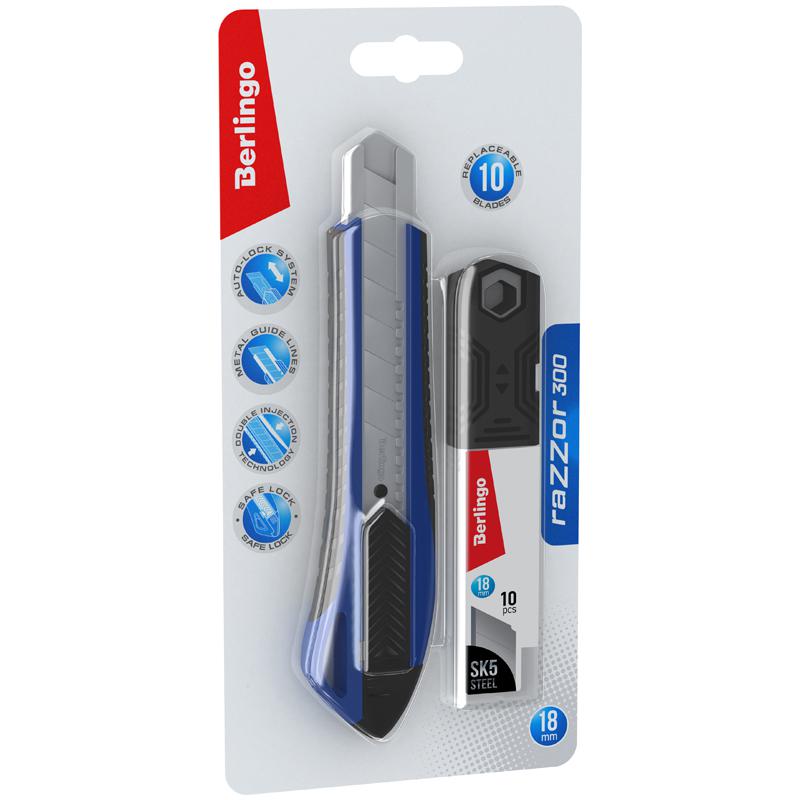 Нож канц. 18мм Berlingo BM4132_2c "Razzor 300", синий + лезвия 10шт. 341936