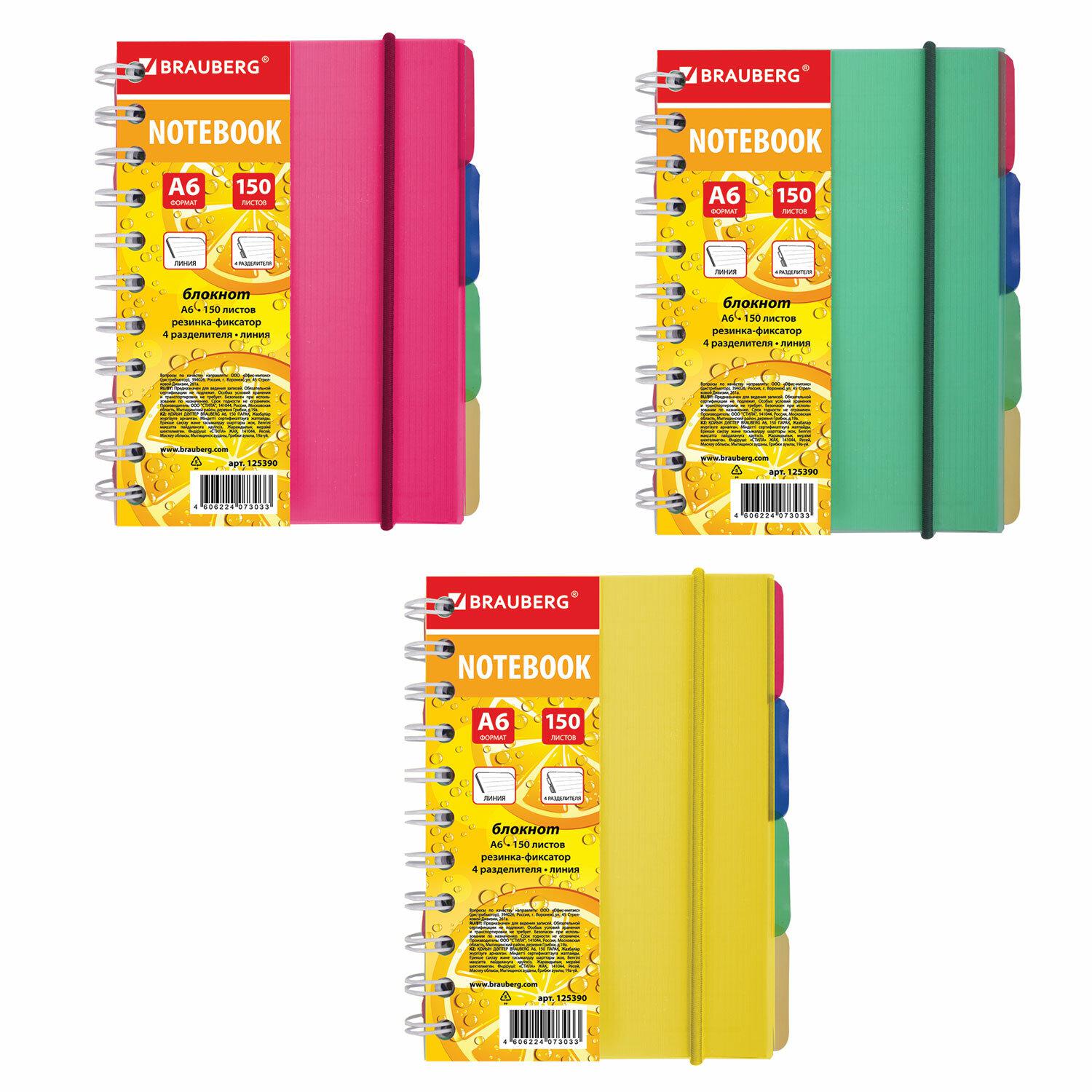 Блокнот А6 Brauberg 125390 "Сочный" 150 л., линия, гребень, на резинке, пластиковая обложка 125390